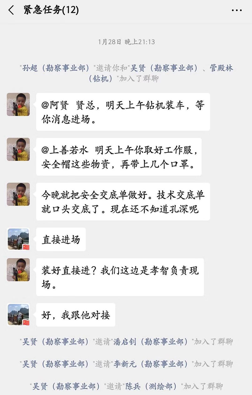 大年初四,又值大家避疫在家,組織充足的技術(shù)人員和施工設(shè)備難度較大。在此情況下,工勘集團黨委第四支部書記、勘察部經(jīng)理潘啟釗,副經(jīng)理吳賢,測繪部經(jīng)理陳兵,副經(jīng)理閆肖飛,勘察部專業(yè)總工許建瑞,生產(chǎn)主任孫超,黨員李先圳,優(yōu)秀員工鄭孝智等一大批勘察、測繪部門員工主動請纓,要求立即返崗開展工作。