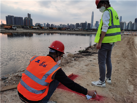 2月底,在香港抗疫形勢最為嚴峻的時刻,測量團隊第一批趕赴現(xiàn)場。當時的施工場地還是一片雜草叢生的荒灘,野豬成群,且時有蟒蛇、鱷魚出沒,野外作業(yè)環(huán)境異常惡劣、兇險。且當時場地尚未搭設臨建,測量人員的住宿被統(tǒng)一安排在市區(qū)酒店,即使冒著被疫情傳染的高風險,他們依然選擇逆行而上。