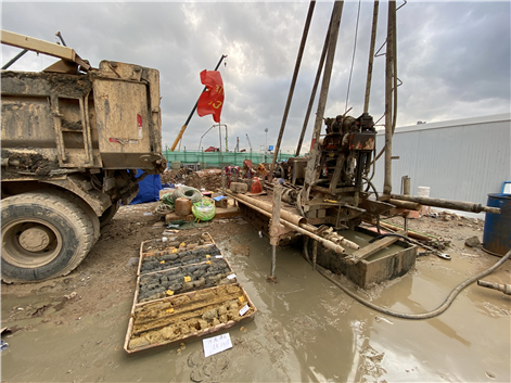 3月6日,臨時棧橋正式通車,勘察團隊與眾多施工隊伍一同入場,并在當天晚上就提供了現(xiàn)場施工緊急需要的地質(zhì)柱狀圖及剖面圖。由于現(xiàn)場參建單位眾多,作業(yè)面有限,工人們只能開展交叉作業(yè),在泥土松軟的場地上不斷搬動鉆機,調(diào)整作業(yè)地點。